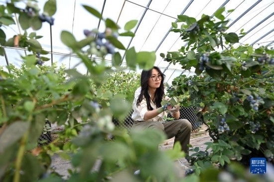 呂欣在大棚內(nèi)采摘藍(lán)莓(5月3日攝)。