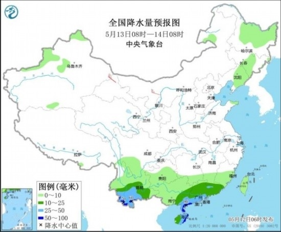 全國降水量預(yù)報圖(5月12日08時-13日08時)