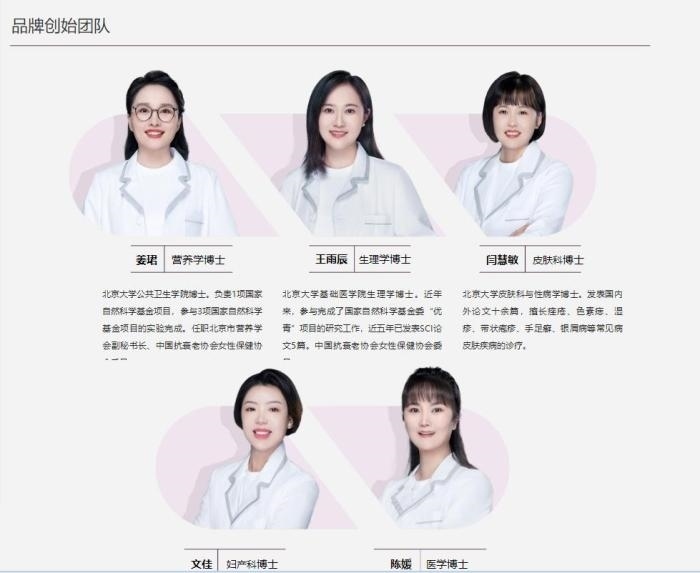 “五個女博士”官網(wǎng)信息則宣傳,該品牌成立于2019年7月,由來自北京大學(xué)的五個醫(yī)學(xué)女博士聯(lián)合創(chuàng)立,官網(wǎng)首頁還放上了五人的簡介。其主要產(chǎn)品包括膠原蛋白肽維c飲品、每日亢唐植物飲品等。