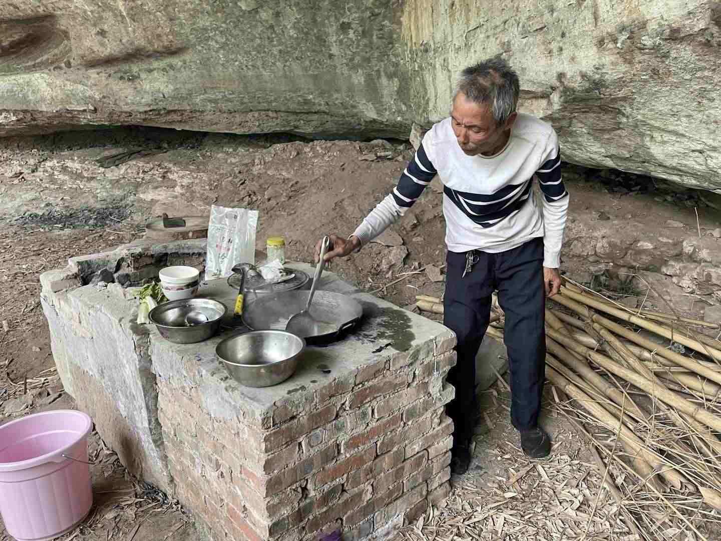 紅星新聞?dòng)浾哂^察發(fā)現(xiàn),巖洞里確實(shí)沒(méi)有豬油或菜油,只有小半袋米和半袋鹽。但巖洞里有灶臺(tái)。據(jù)說(shuō)很久以前這個(gè)洞里住過(guò)人,但已去世幾十年;后來(lái),還有人在洞里養(yǎng)雞,巖洞里有兩間像房子的構(gòu)筑物,但是沒(méi)有門(mén)。馮必全砍了幾根竹子搭架做床,棉被褥子則是鄉(xiāng)親們不要的物件,他去要過(guò)來(lái)的。