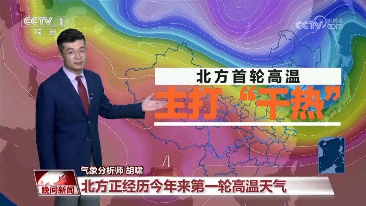 氣象分析師 胡嘯:目前,我們國家北方正在經(jīng)歷今年第一輪大范圍的高溫天氣過程。這一輪高溫天氣過程最大的特點(diǎn),就是干熱。伴隨著一個高壓擠區(qū)的逐漸東移,高溫逐漸顯現(xiàn),在擠區(qū)之內(nèi)是下沉增溫,晴朗少云的天氣。