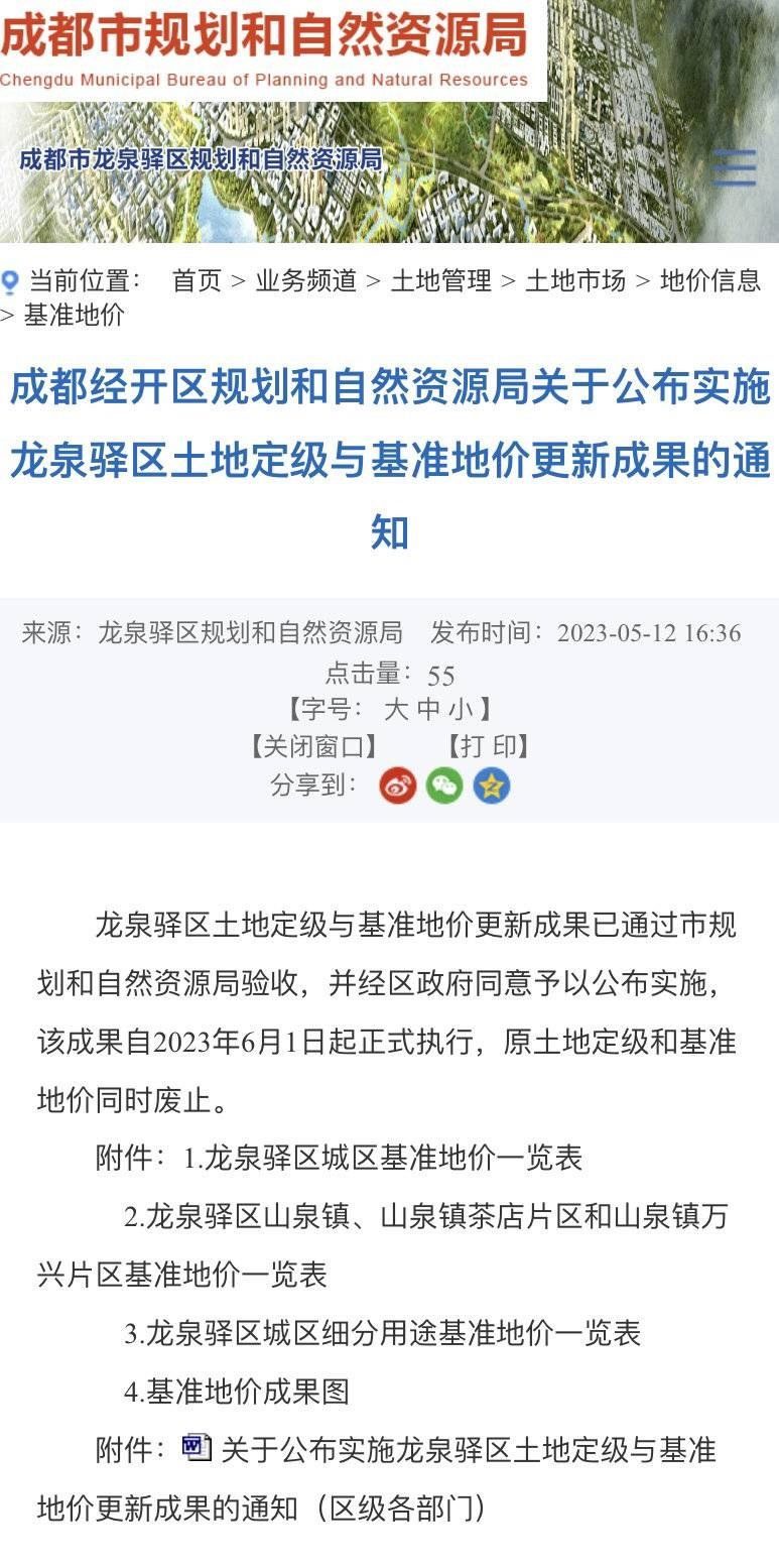 據(jù)悉,成都經(jīng)開區(qū)規(guī)劃和自然資源局門戶網(wǎng)站于2023年5月12日發(fā)布了龍泉驛區(qū)土地定級(jí)與基準(zhǔn)地價(jià)更新成果,此成果嚴(yán)格按照《四川省國(guó)土資源廳辦公室轉(zhuǎn)發(fā)〈國(guó)土資源部辦公廳關(guān)于加強(qiáng)公示地價(jià)體系建設(shè)和管理有關(guān)問題的通知〉的通知》(川國(guó)土資辦發(fā)〔2017〕33號(hào))文件要求,經(jīng)龍泉驛區(qū)人民政府批準(zhǔn)后對(duì)外公布,該成果主要內(nèi)容為龍泉驛區(qū)城鎮(zhèn)國(guó)有建設(shè)用地使用權(quán)不同用途評(píng)估的平均價(jià)格,并未標(biāo)注“迪士尼預(yù)留用地”相關(guān)內(nèi)容。