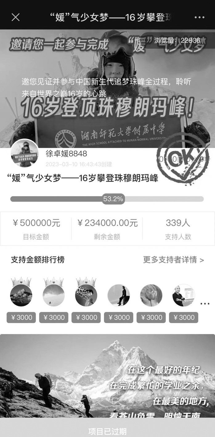 5月15日,揚子晚報紫牛新聞記者再次點開徐卓媛當初發(fā)起助力登峰的眾籌鏈接,發(fā)現(xiàn)該項目已過期,籌款進度最終定格在53.2%,最終籌集到資金266000元。除去徐江雷朋友們贊助的這二十多萬元,據(jù)了解,還有一些企業(yè)也出資贊助了徐卓媛登頂珠峰的活動。徐江雷此前告訴記者,江蘇一家藥企看到此前揚子晚報對于徐卓媛的報道后(本報今年3月17日刊登《眾籌50萬,助16歲女兒挑戰(zhàn)珠峰》一文),被她小小年紀敢于攀登高峰的精神所打動,秉承著“少年強則國強”的理念,慷慨贊助徐卓媛登山資金30萬元。