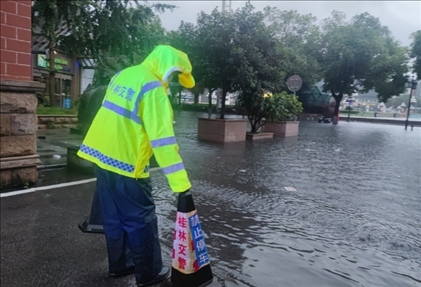 暴雨過后,城市道路積水嚴(yán)重,城區(qū)出現(xiàn)內(nèi)澇,市民蹚水出行。