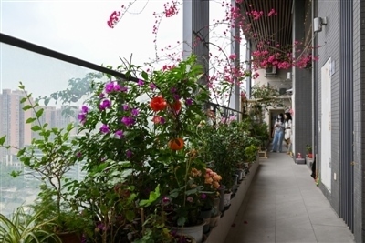 ■ 在這面美麗的花墻背后,是小區(qū)開(kāi)發(fā)商和樓棟240戶人家,共同打造出的花草童話——由開(kāi)發(fā)商種植的三角梅在交房時(shí)一并移交給業(yè)主,業(yè)主在門口的公共空間打造屬于自己的“小花園”。10年時(shí)間過(guò)去,240戶居民打造出了32層高的三角梅,還有繡球、蝴蝶蘭、多肉等綠植,櫻桃樹、桃樹、葡萄藤等水果植物,花椒、大蒜、番茄、西蘭花等蔬菜。
