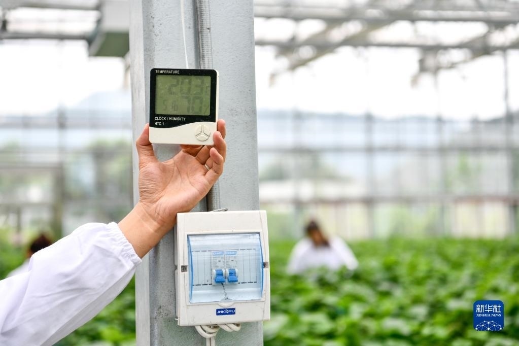 5月23日,工作人員在貴陽(yáng)市開(kāi)陽(yáng)縣南江蔬菜良種繁育中心查看育苗大棚內(nèi)溫濕度。