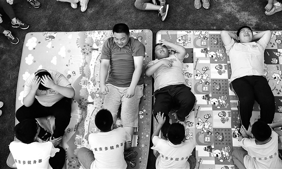 在一個(gè)中小學(xué)超重學(xué)生健康夏令營里,孩子們在做仰臥起坐。何海兒 攝/視覺中國