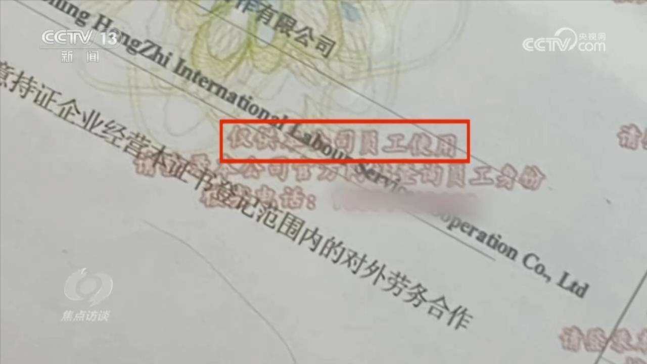 在辦公室擺放的證件是一家名為遼寧恒志國際勞務(wù)合作有限公司的對外勞務(wù)合作經(jīng)營資格證。為了防止別人冒用自己的資質(zhì),在證件上明確寫著“僅供本公司員工使用”,還印上了公司的核實(shí)電話。按照這個號碼,記者聯(lián)系了遼寧恒志國際勞務(wù)合作有限公司,公司負(fù)責(zé)人卻表示不認(rèn)識眾國國際。