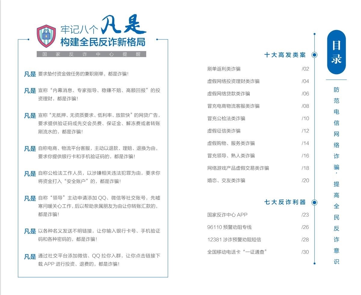 人民網(wǎng)北京6月16日電 (記者郝萍、梁秋坪)按照中央宣傳部、公安部聯(lián)合部署開展的“全民反詐在行動”集中宣傳月活動有關(guān)要求,國家反詐中心編寫制作并最新推出《2023版防范電信網(wǎng)絡(luò)詐騙宣傳手冊》(以下簡稱《手冊》),詳細梳理10類高發(fā)電信網(wǎng)絡(luò)詐騙案件特點和詐騙手法,深入介紹7大反詐利器的主要功能和使用方法,進一步擴大反詐宣傳覆蓋面,提升廣大群眾識騙防騙意識和能力。