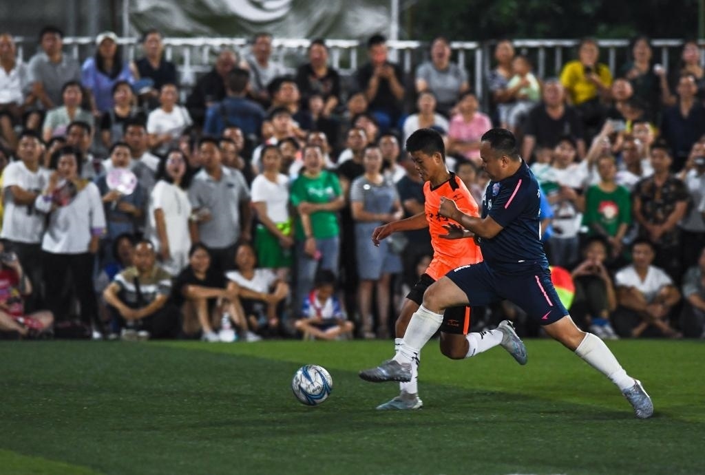 6月9日,新中村足球隊(duì)球員(左)與鳳凰村足球隊(duì)球員在比賽中拼搶。新華社記者 楊文斌 攝
