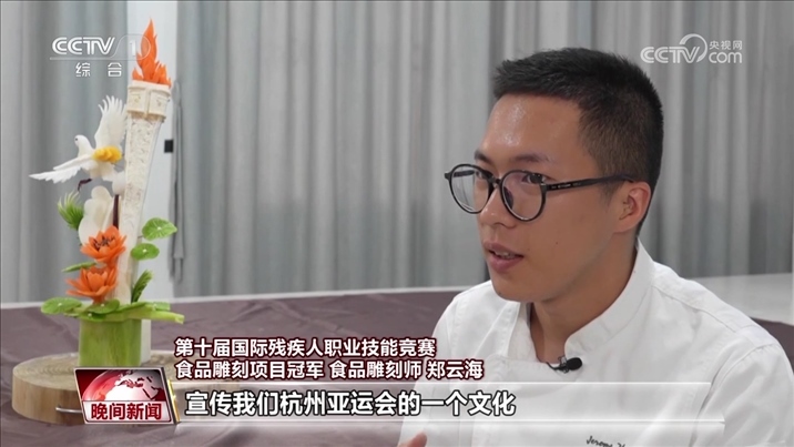 第十屆國(guó)際殘疾人職業(yè)技能競(jìng)賽食品雕刻項(xiàng)目冠軍 食品雕刻師 鄭云海最近有火炬(傳遞),寓意就是美好、和平,還有吉祥。我想用自己的技能去宣傳我們杭州亞運(yùn)會(huì)的一個(gè)文化。