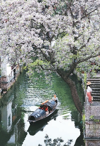 夕陽的余暉灑在寶珠橋上,烏篷船從拱形橋洞中悠然而過,河面蕩起層層漣漪。幾名身著漢服的姑娘在橋頭觀景、拍照,笑語連連。