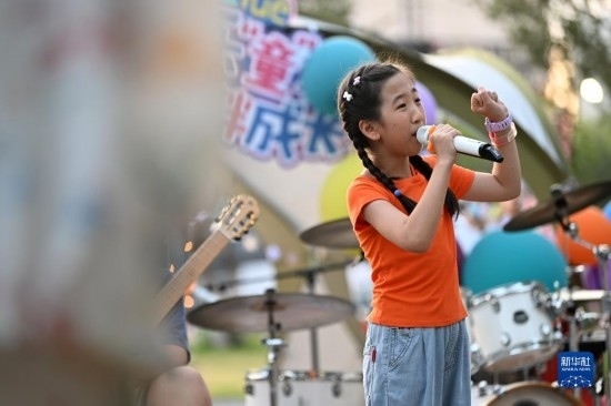 7月8日,小朋友在帳篷音樂會上表演節(jié)目。