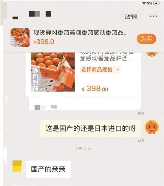 隨后,記者隨機在電商平臺選擇三款標明是“進口水果”的產(chǎn)品進行詢問,結(jié)果對方均表示自己的水果是“國產(chǎn)的”。當記者詢問一電商客服,標價398元兩斤的“現(xiàn)貨靜岡番茄”和標價178元一斤的日本淡雪白草莓是哪里產(chǎn)的時,對方回答“親親,國產(chǎn)的”。