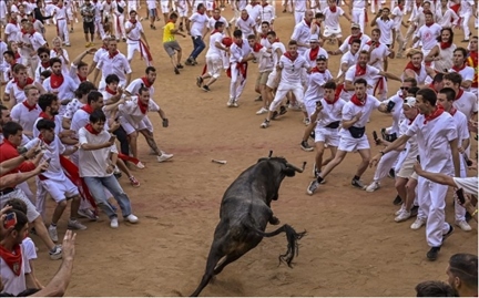 當(dāng)?shù)貢r間2023年7月10日,西班牙潘普洛納,圣費爾明節(jié)期間,狂歡者站在公牛周圍,公牛進入斗牛場。