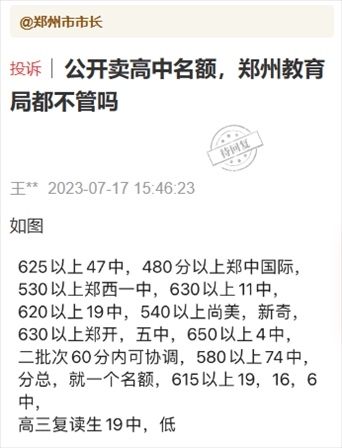7月16日,有群眾通過頂端新聞“我想@領(lǐng)導(dǎo)”平臺向鄭州市教育局局長留言:“掏錢就能上?鄭州中招販賣名額成風(fēng)”“公開賣高中名額,鄭州教育局都不管嗎”等類似留言。
