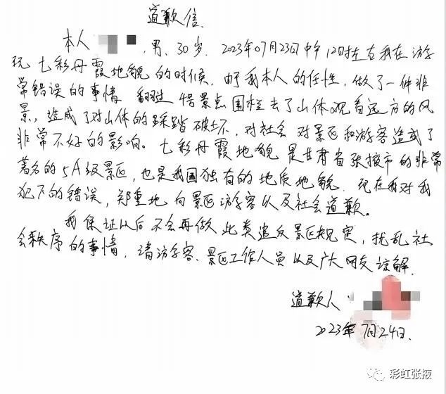 同時,張掖丹霞大景區(qū)管理委員會(張掖國家地質(zhì)公園管理局)微信公眾號還發(fā)布了這名游客的道歉信。該游客稱“由于本人的任性,做了一件非常錯誤的事情,翻過4號景點圍欄去了山體觀看遠方的風景,造成了對山體的踩踏破壞,對社會、對景區(qū)和游客造成了非常不好的影響。”