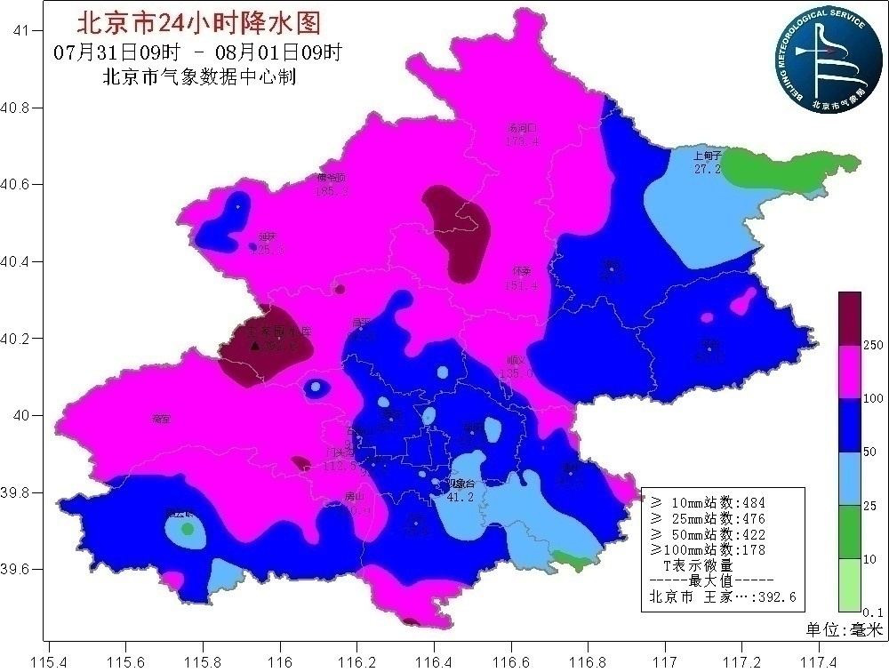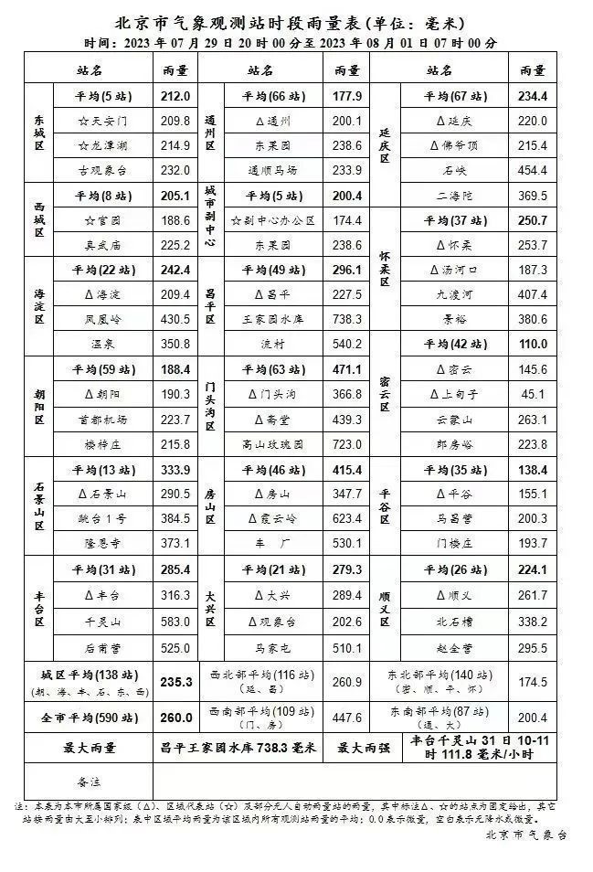 據(jù)北京市氣象臺消息,29日20時至8月1日7時,北京地區(qū)全市平均降雨量260.0毫米,城區(qū)平均235.3毫米,房山區(qū)平均415.4毫米,門頭溝區(qū)平均471.1毫米;最大小時雨強出現(xiàn)在豐臺千靈山,31日10-11時111.8毫米/小時。