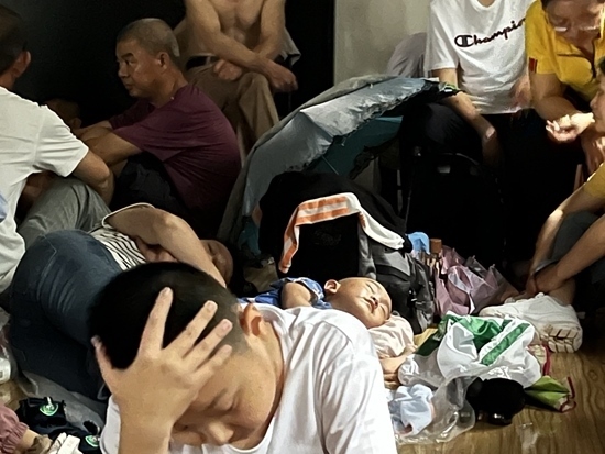 汗味兒、腳臭味兒、霉味兒攪和在一起,溫宇被“熏得頭暈”。室內(nèi)的椅子被搶占一空,講演臺上睡滿了打地鋪的乘客。幾乎所有人都表情木然,“累得不想說話”。