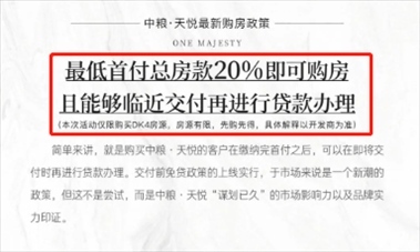 8月26日,紅星資本局向“中糧天悅”售樓部求證此時(shí),一名置業(yè)顧問回復(fù)稱,最近確實(shí)推出了“先交付后還貸”的購房政策,購房者可以先交首付,簽訂購房合同,交房前再辦理貸款即可。