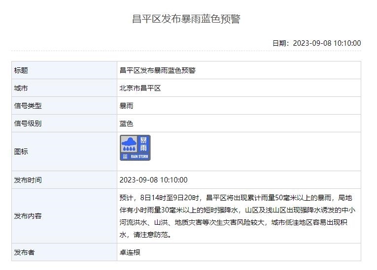 預(yù)計(jì),8日14時(shí)至9日20時(shí),昌平區(qū)將出現(xiàn)累計(jì)雨量50毫米以上的暴雨,局地伴有小時(shí)雨量30毫米以上的短時(shí)強(qiáng)降水,山區(qū)及淺山區(qū)出現(xiàn)強(qiáng)降水誘發(fā)的中小河流洪水、山洪、地質(zhì)災(zāi)害等次生災(zāi)害風(fēng)險(xiǎn)較大,城市低洼地區(qū)容易出現(xiàn)積水,請注意防范。