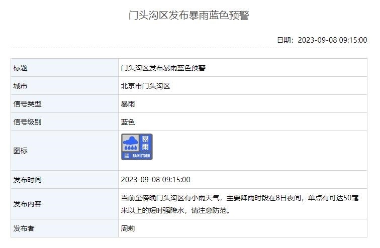 當(dāng)前至傍晚門頭溝區(qū)有小雨天氣,主要降雨時(shí)段在8日夜間,單點(diǎn)有可達(dá)50毫米以上的短時(shí)強(qiáng)降水,請注意防范。