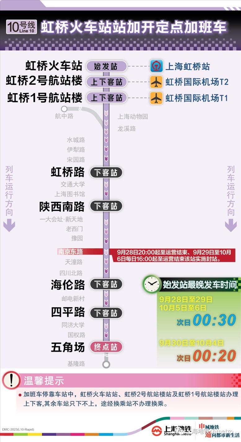 此外,9月28日20:00至運(yùn)營結(jié)束,以及9月29日至10月6日的每日16:00至運(yùn)營結(jié)束,地鐵2、10號線南京東路站,14號線豫園站計劃實施封站跳停。
