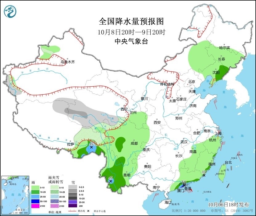 10月8日20時(shí)至9日20時(shí),新疆西南部、青海中南部、西藏北部等地的部分地區(qū)有小到中雪或雨夾雪;西藏東南部、四川西南部、云南中部和南部、廣東和福建的沿海地區(qū)以及遼寧東部等地的部分地區(qū)有中到大雨,其中廣東南部沿海地區(qū)局地有暴雨(50~60毫米)。東海南部海域、臺(tái)灣海峽6~8級風(fēng)、陣風(fēng)9~10級,南海北部海域、北部灣偏北海域有7~9級風(fēng)、陣風(fēng)10~11級(見圖3)。