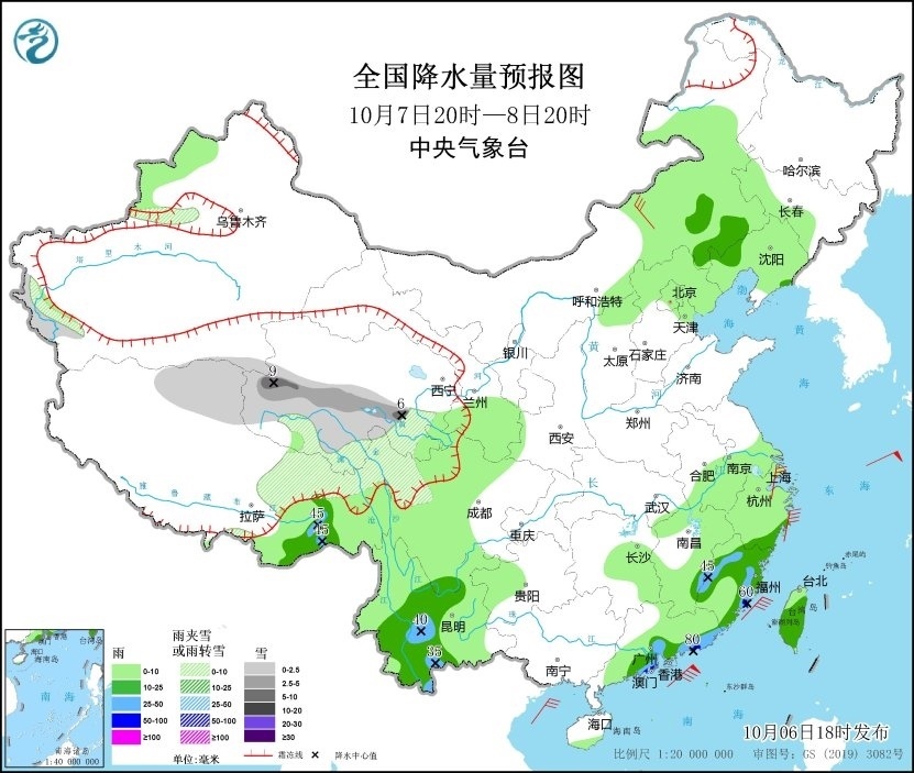 10月6日20時(shí)至7日20時(shí),新疆南疆盆地西部沿山地區(qū)、青海南部、西藏東部等地有小到中雪或雨夾雪;西藏東南部、四川盆地東部和南部、云南中東部、福建中南部、廣東東部、海南島南部、臺(tái)灣島西部等地部分地區(qū)有中到大雨,其中,廣東東部和福建南部沿海等地局部地區(qū)有暴雨(50~65毫米)。內(nèi)蒙古中東部、遼東半島、浙江東部沿海等地部分地區(qū)有4~6級風(fēng),西藏中部部分地區(qū)有6~7級風(fēng)。臺(tái)灣海峽將有6~7級、陣風(fēng)8級的東北風(fēng),南海東北部海域?qū)⒂?~9級、陣風(fēng)10級的偏北風(fēng)(見圖1)。