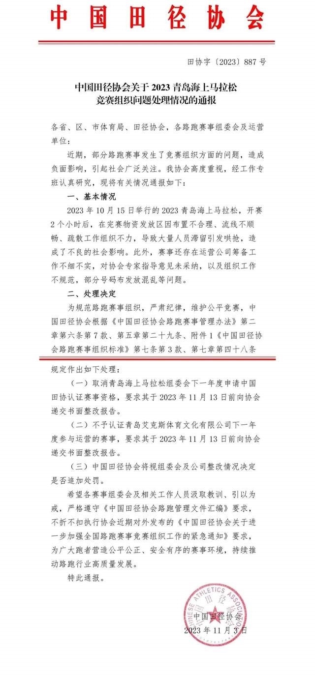 央視網(wǎng)消息:據(jù)“中國馬拉松平臺”官微消息,近日,部分路跑賽事出現(xiàn)了一些競賽組織問題,引發(fā)社會廣泛關(guān)注,造成了不良的社會影響。中國田徑協(xié)會高度重視、全面調(diào)查,依據(jù)事實和路跑賽事管理規(guī)定,從加強(qiáng)競賽組織,壓實各方主體責(zé)任,提示行業(yè)風(fēng)險隱患的角度,對相關(guān)單位和人員進(jìn)行了相應(yīng)處理?,F(xiàn)將處理情況通報如下: