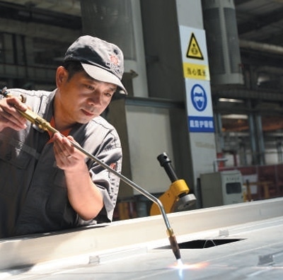 周晶輝正在對(duì)鋁合金車(chē)體進(jìn)行焊接。金萬(wàn)寶攝