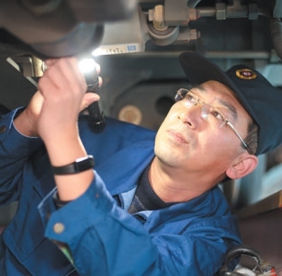 時(shí)而膝蓋微弓,腰部略彎;時(shí)而敲敲打打,上前細(xì)嗅……只見(jiàn)劉波進(jìn)車(chē)廂、鉆車(chē)底、登車(chē)頂,對(duì)列車(chē)逐一進(jìn)行檢查,不一會(huì)兒,動(dòng)車(chē)隱患就被及時(shí)發(fā)現(xiàn)并排除。