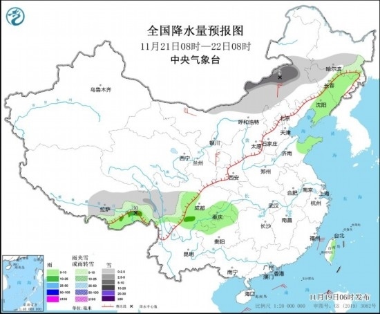 11月21日08時至22日08時,內(nèi)蒙古中部、黑龍江南部、吉林西部、西藏東南部、川西高原等地部分地區(qū)有小雪或雨夾雪,其中,內(nèi)蒙古中東部、西藏東部等地部分地區(qū)有中到大雪(5~9毫米)。吉林東部、遼寧中東部、山東半島、西藏東南部、四川南部、重慶南部、貴州西北部等地部分地區(qū)有小到中雨,其中,西藏東南部等地部分地區(qū)有大雨(25~30毫米)。內(nèi)蒙古西部和中部、寧夏等地部分地區(qū)有4~6級風(fēng)(見圖4)。
