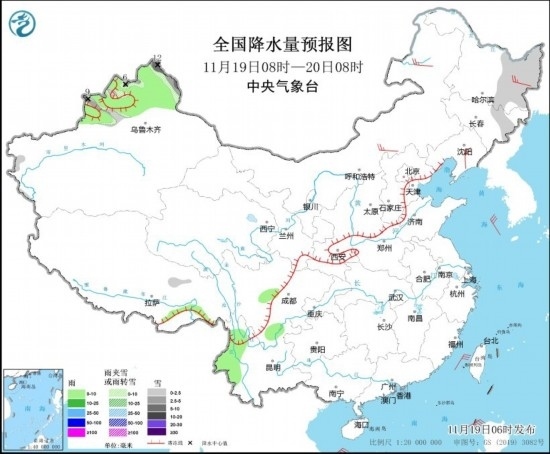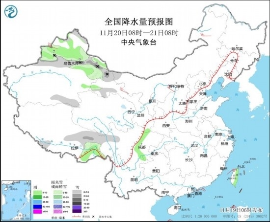 11月19日08時至20日08時,新疆北部和伊犁河谷、黑龍江東部、吉林東部等地部分地區(qū)有小雪或雨夾雪,其中,新疆北部部分地區(qū)有中到大雪,局地暴雪(10~12毫米)。新疆北部、西藏東南部、四川南部、云南西部等地部分地區(qū)有小雨。內(nèi)蒙古中部和東部、黑龍江東部、遼寧東部等地部分地區(qū)有4~5級風(fēng)(見圖2)。