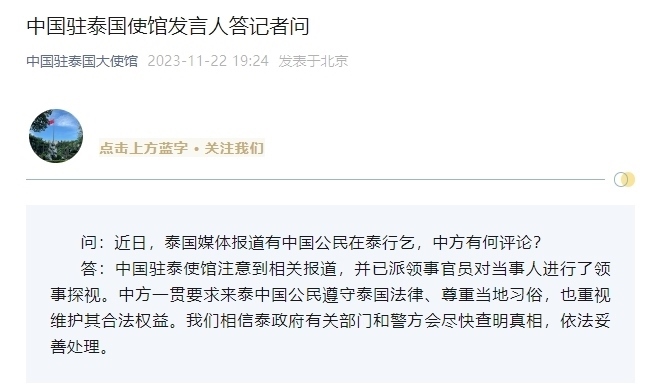 ·中國(guó)駐泰國(guó)大使館回應(yīng)網(wǎng)傳有中國(guó)公民在泰行乞:注意到相關(guān)報(bào)道,并已派領(lǐng)事官員對(duì)當(dāng)事人進(jìn)行了領(lǐng)事探視。