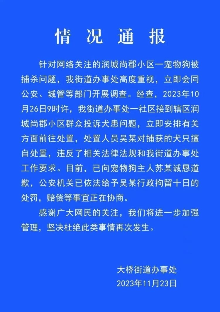 ·安徽安慶通報(bào)“寵物犬被捕狗隊(duì)抓走后送往市場宰殺”:處置人員被行拘10日。