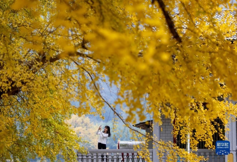 11月24日,游客在貴州省遵義市正安縣謝壩仡佬族苗族鄉(xiāng)上關(guān)村拍攝古銀杏樹(shù)。