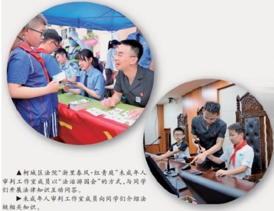 “‘紅青庭’品牌Logo中,‘紅’字既突出黨建統(tǒng)領(lǐng)又寓意紅領(lǐng)巾,是百折不撓的精神象征;‘青’字代表著青少年,是肩負未來的青春力量;‘庭’字則是指少年法庭和家庭。”胡衛(wèi)民介紹,柯城區(qū)法院依托“浙里春風·紅青庭”品牌,成立青少年法治教育實踐基地和未成年人審判工作室,積極開展內(nèi)外聯(lián)動,在持續(xù)加強涉未成年人刑事、民事、行政審判融合的基礎(chǔ)上,不斷深化與公安、檢察、教育、團委、婦聯(lián)等部門的協(xié)調(diào)配合,構(gòu)筑全方位、多鏈條的綜合司法保護機制。