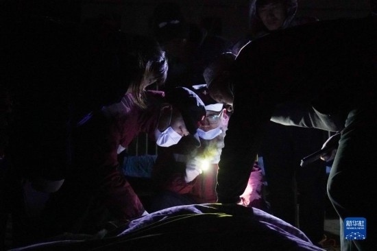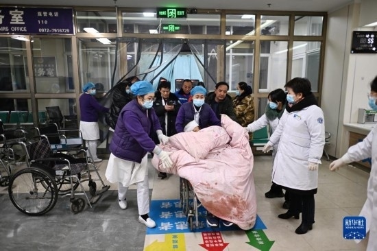 12月19日,在甘肅省臨夏回族自治州積石山保安族東鄉(xiāng)族撒拉族自治縣中西醫(yī)結合醫(yī)院門口,醫(yī)務工作者查看傷者情況。