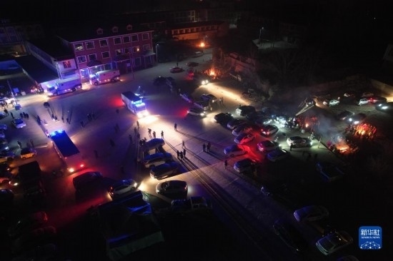 12月19日,在甘肅省臨夏回族自治州積石山保安族東鄉(xiāng)族撒拉族自治縣大河家鎮(zhèn)大河村,多方力量開展救援(無人機照片)。