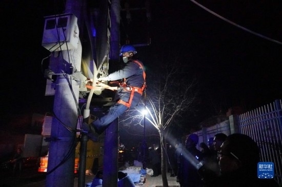 12月19日,在甘肅省臨夏回族自治州積石山保安族東鄉(xiāng)族撒拉族自治縣中西醫(yī)結合醫(yī)院門口,電力部門工作人員搶修電力設施。