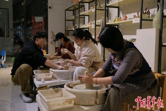 12月3日,北京市朝陽區(qū)一處建材城頂層,夜校陶藝課老師柴鑫杰(左一)在授課,當(dāng)天課程的內(nèi)容是陶藝?yán)摺V星鄨蟆ぶ星嗑W(wǎng)見習(xí)記者 田嘉碩/攝