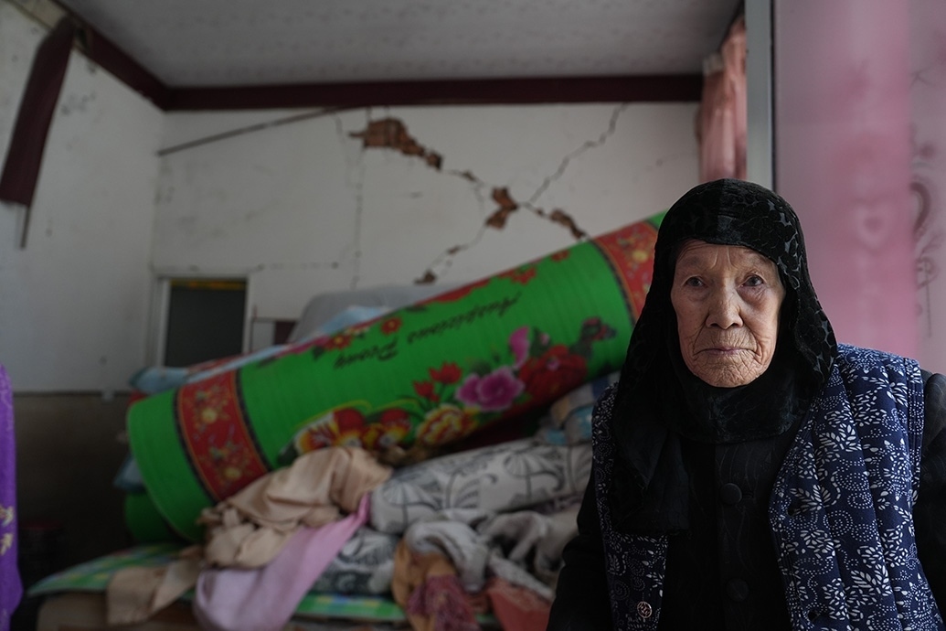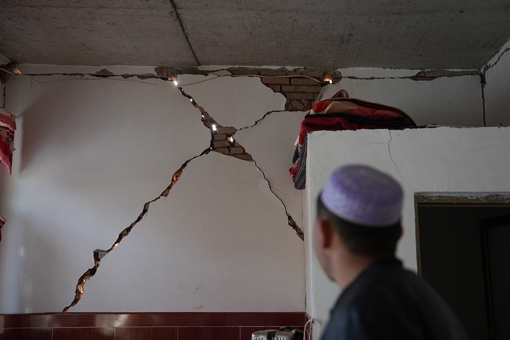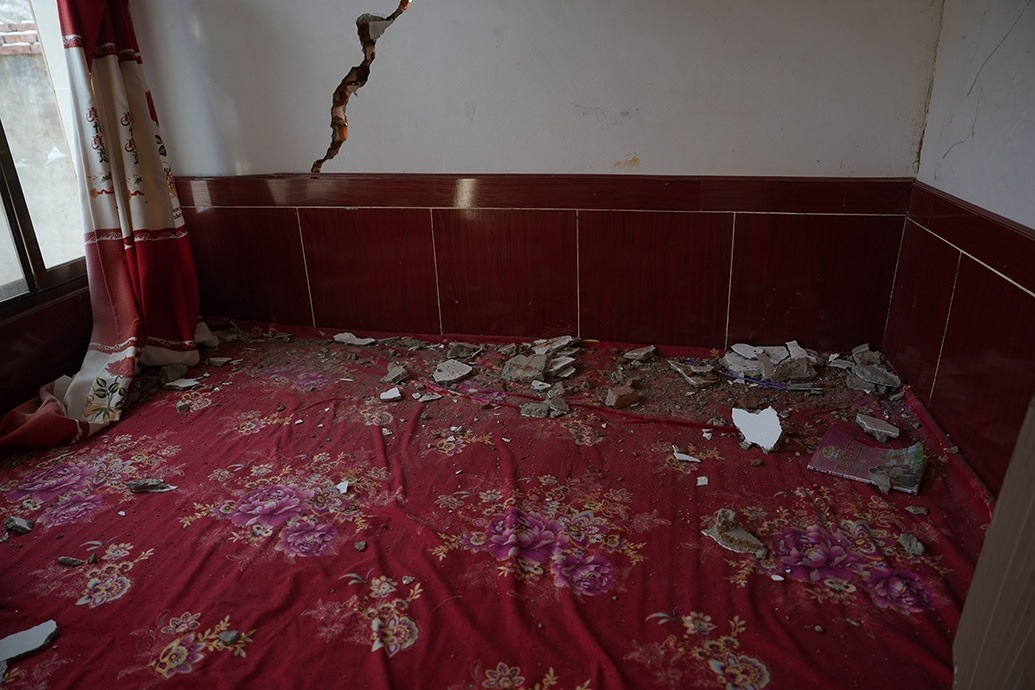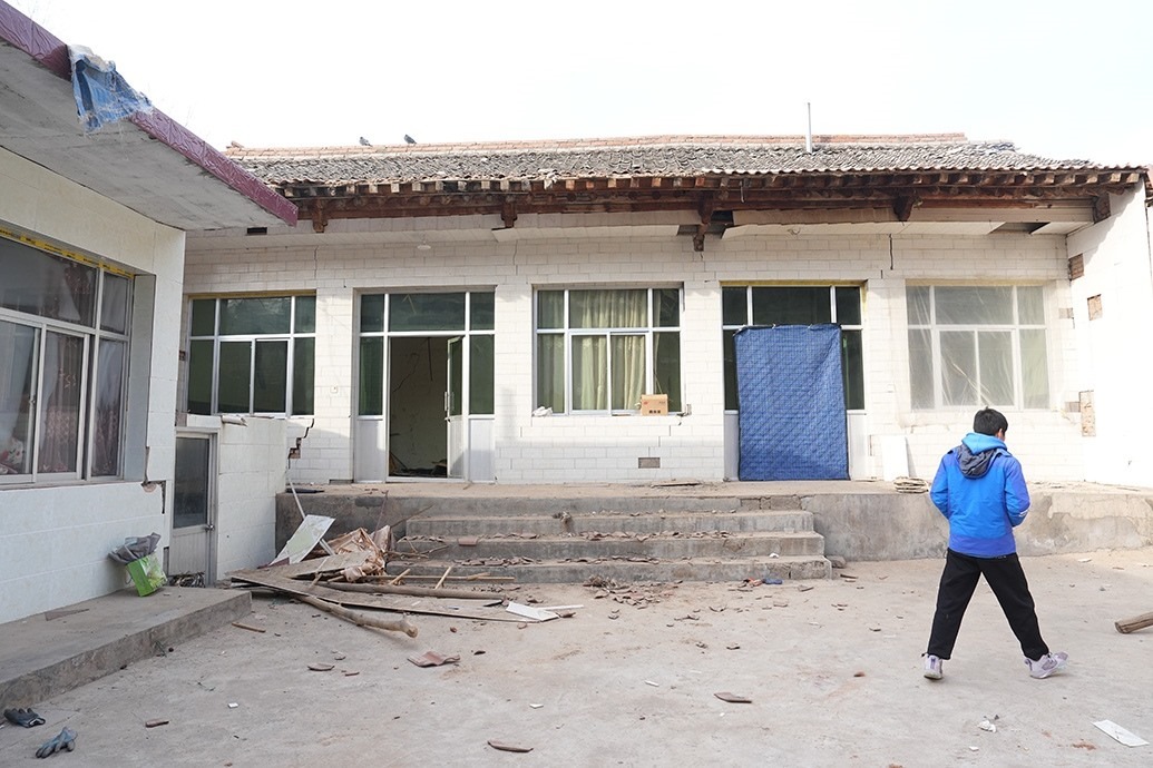 12月23日當(dāng)天,馬國(guó)忠和叔叔伯伯兩家都在家門(mén)前搭起剛領(lǐng)的帳篷。叔叔馬進(jìn)明家受損嚴(yán)重,兩堵磚墻的銜接處完全開(kāi)裂,像條拉鏈被猛地拽下;天花板掉了大半,木頭架構(gòu)的屋頂赫然露在豁口里。所幸,他和家人平時(shí)在縣城租房住。