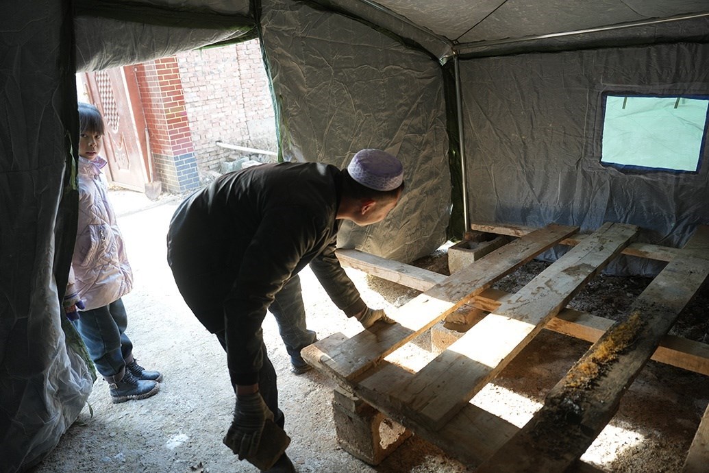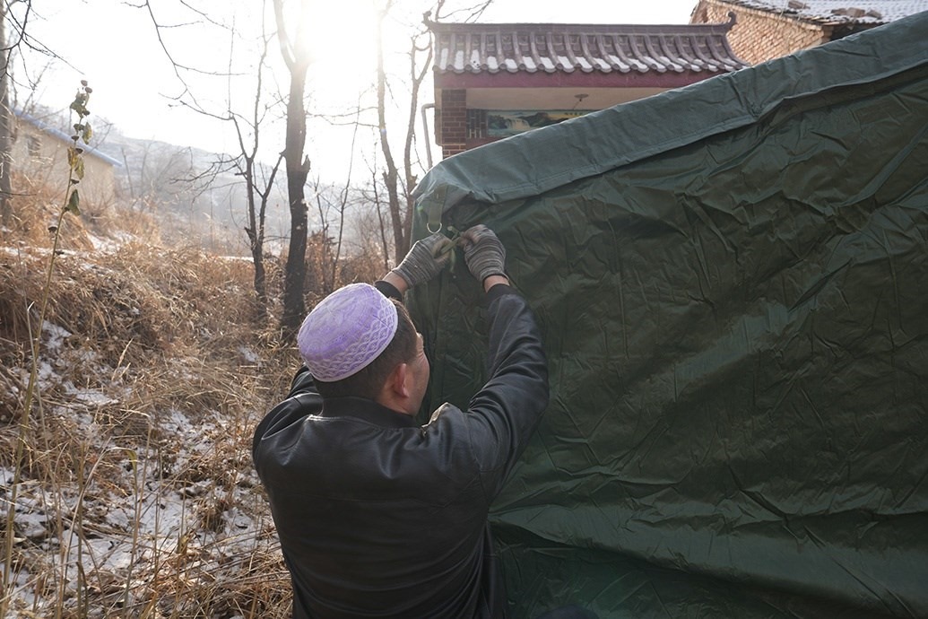 馬國(guó)忠的叔叔在家門(mén)口搭帳篷。