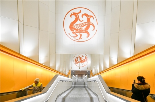 17號線太陽宮站里,仿佛照射進太陽金光,站廳里的暖陽壁畫、上下扶梯時墻壁上的神鳥瓦當(dāng),都有不少乘客舉著手機拍照。