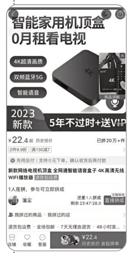 “0月租看電視”“這是一款可以讓你一輩子不用交有線電視費的機(jī)頂盒”……在電商平臺上,一款網(wǎng)絡(luò)電視機(jī)頂盒各型號版本已售出超過20萬件,在同類商品中銷售量最高。記者購買了一款售價47.88元的型號,套裝內(nèi)包括機(jī)頂盒、配件以及永久會員。