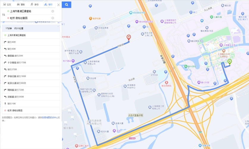 “途經(jīng)滬青平公路時(shí),平臺(tái)也愛(ài)規(guī)劃逆行路線?!标愱?yáng)陽(yáng)提供的第3條逆行路線正屬于這一情況。這是從京華路187弄送往南山雨果小區(qū)的一單,平臺(tái)規(guī)劃的路線中,指示騎手從明珠路右拐進(jìn)入滬青平公路向西騎行至葉聯(lián)路再向南。可是,滬青平公路在葉聯(lián)路路口處沒(méi)有過(guò)街橫道線,此時(shí),平臺(tái)索性規(guī)劃騎手沿著滬青平公路南側(cè)逆向騎行。1月8日,記者實(shí)地走了一遍這段路線:若騎手沿著滬青平公路北側(cè)騎行,需一直向西騎到徐盈路才能過(guò)街,再沿著滬青平公路南側(cè)向東抵達(dá)葉聯(lián)路。手機(jī)顯示,繞行路線比美團(tuán)平臺(tái)規(guī)劃路線遠(yuǎn)了1.2公里。