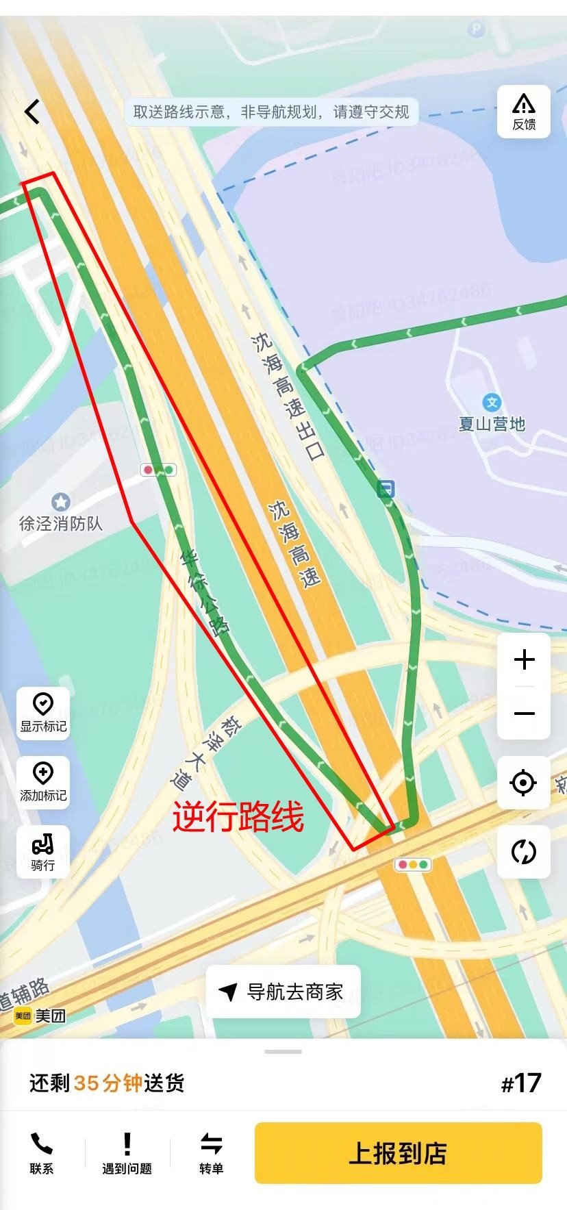 △出了寶山新業(yè)坊若是向北送餐,美團(tuán)騎手的后臺(tái)界面可以看到系統(tǒng)規(guī)劃的就是逆行路線。