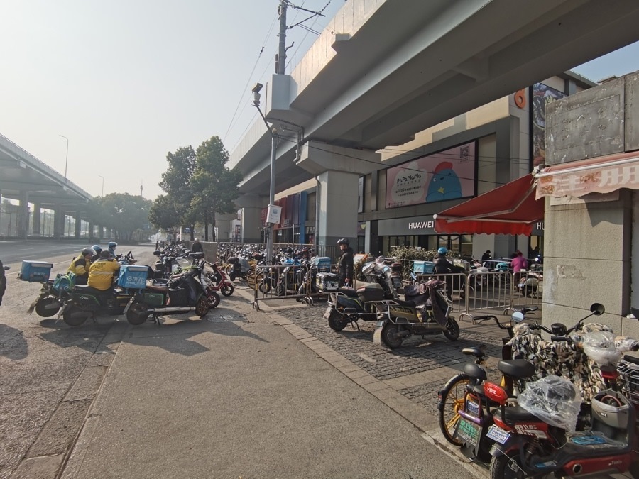 △“寶山新業(yè)坊”商圈外賣業(yè)務(wù)集中,圖為騎手們正在等單。
