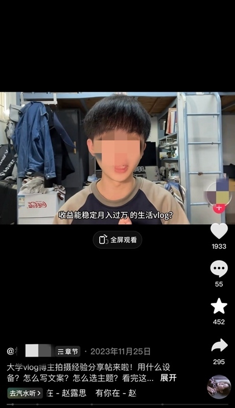 2023年11月25日,一名自稱大學生的短視頻博主向大學生網(wǎng)友分享自己如何零基礎拍攝Vlog穩(wěn)定收益月入過萬元。